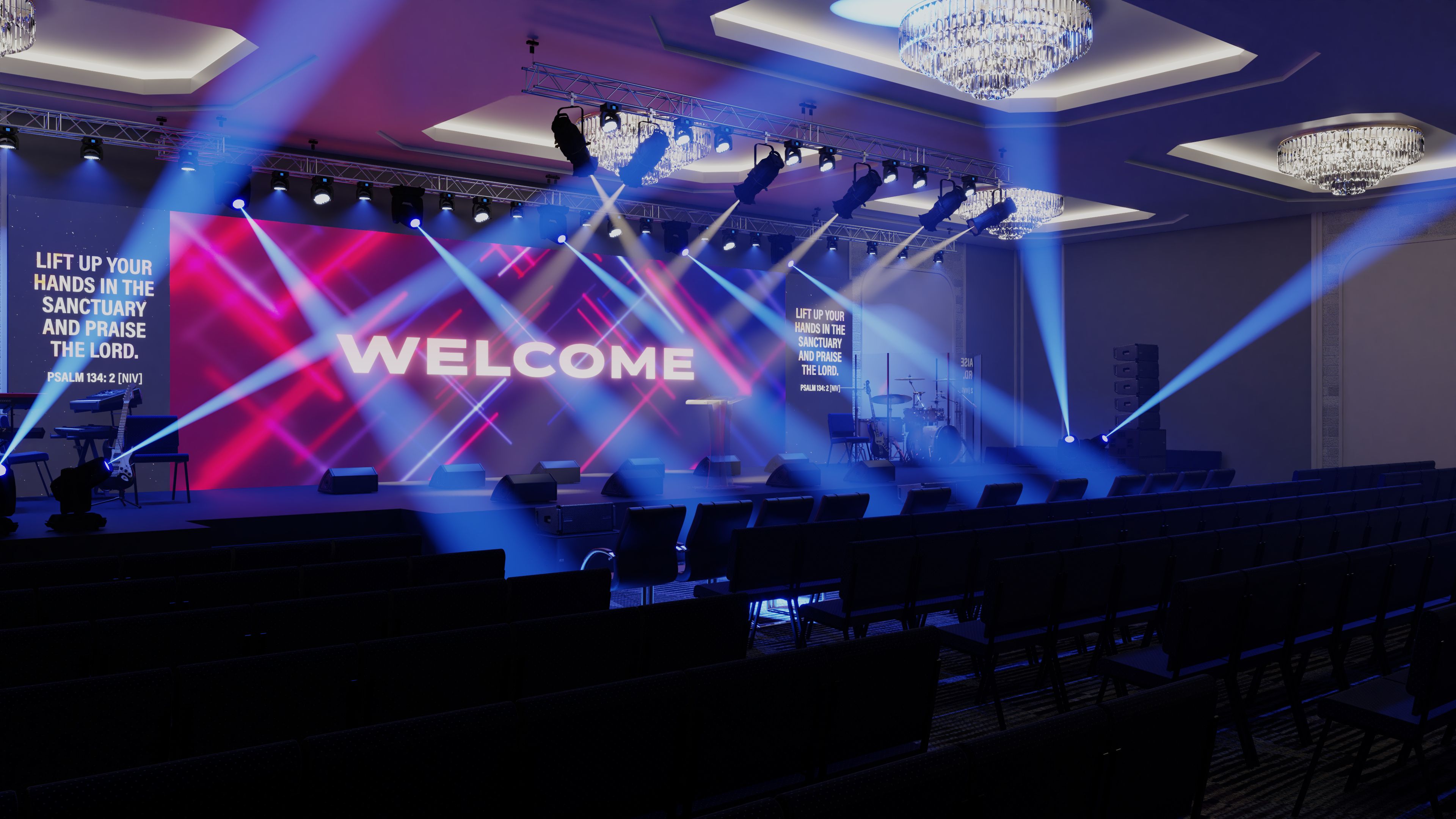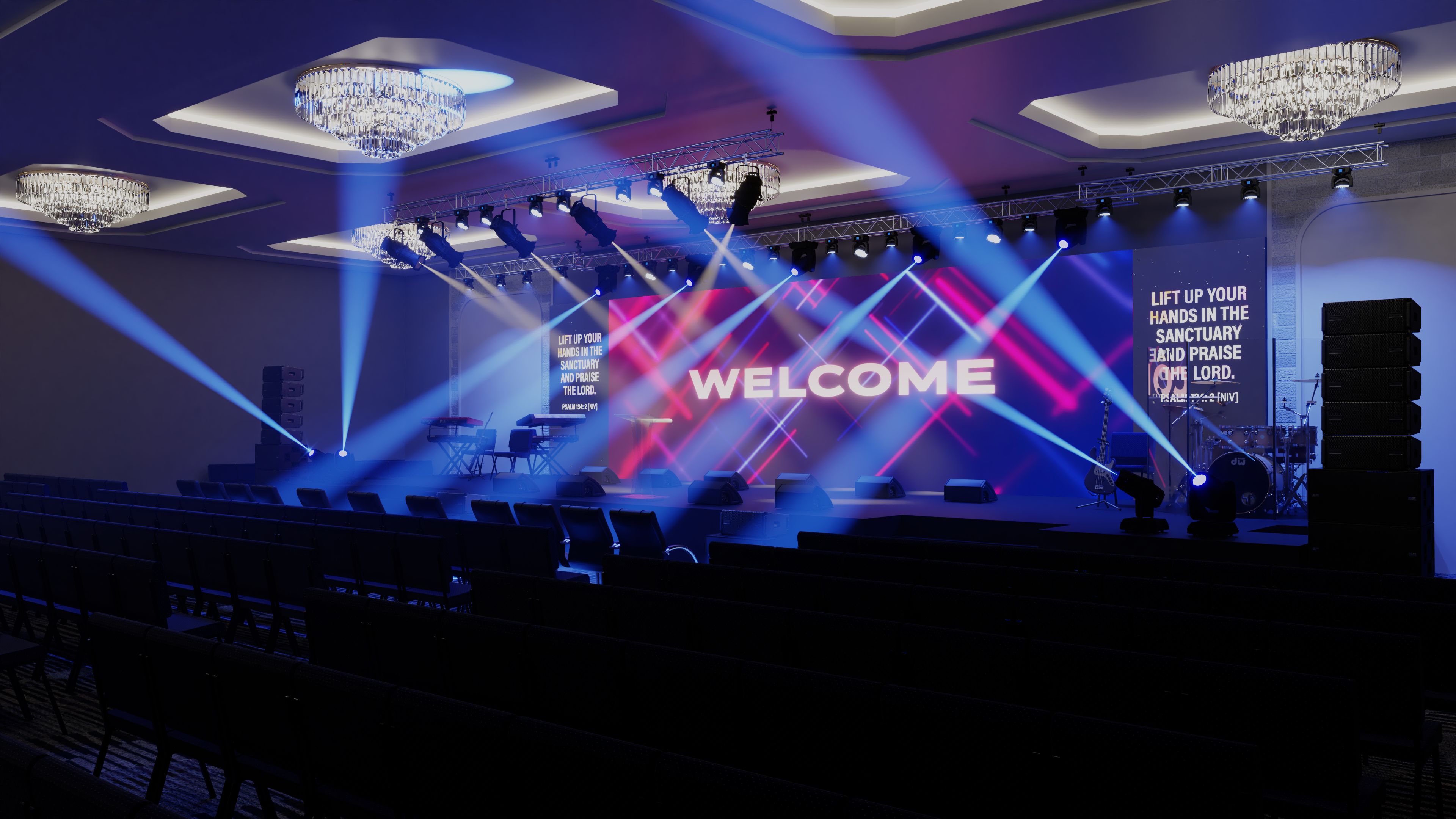 SoundTripUSA was commissioned to design and execute a dynamic stage setup for a two-day conference held in a venue typically reserved for celebrations. Within just three days, our team conceptualized and brought to life a stage design that transformed the atmosphere into one of reverence, energy, and unity.